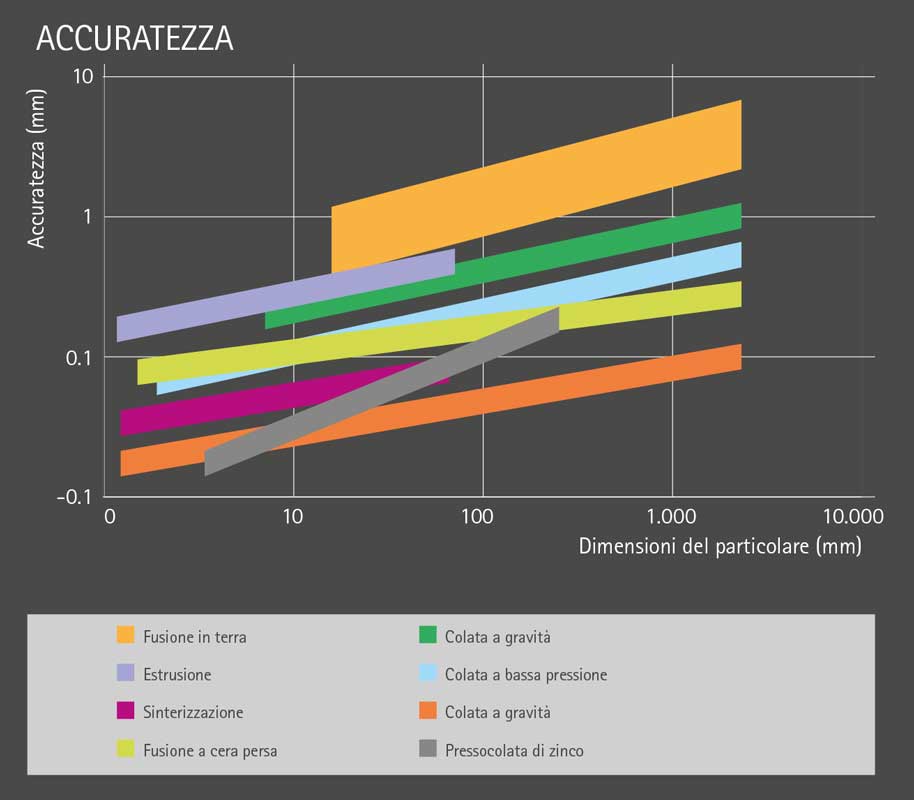 I getti pressocolati sono da 5 a 10 volte più accurati dei prodotti fatti con altri processi come pressatura, la gravità, o la formatura. Si possono equiparare alla tornitura oppure alla fresatura. All’interno della pressocolata, i getti di leghe di zinco sono da 2 a 4 volte più curati di quelli fatti in magnesio o alluminio. Alta solidificazione di ritiro e assorbimento acqua fanno sì che la plastica difficilmente possa raggiungere le stesse tolleranze.